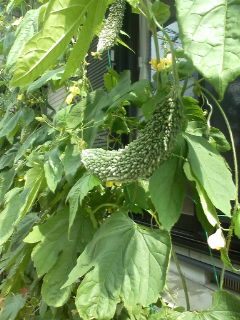 朝ゴーヤに水をあげる時葉の方にも水を掛けると、それだけで涼しげ