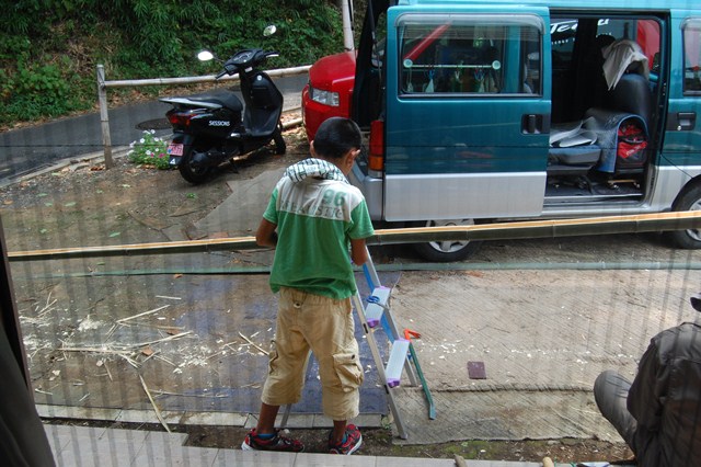 朝からみんなで、流しそうめんをするための準備