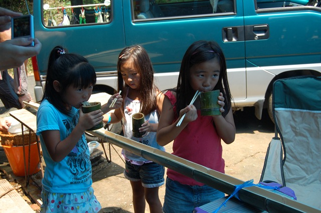 そして、大人はもちろん竹で作ったジョッキでビール